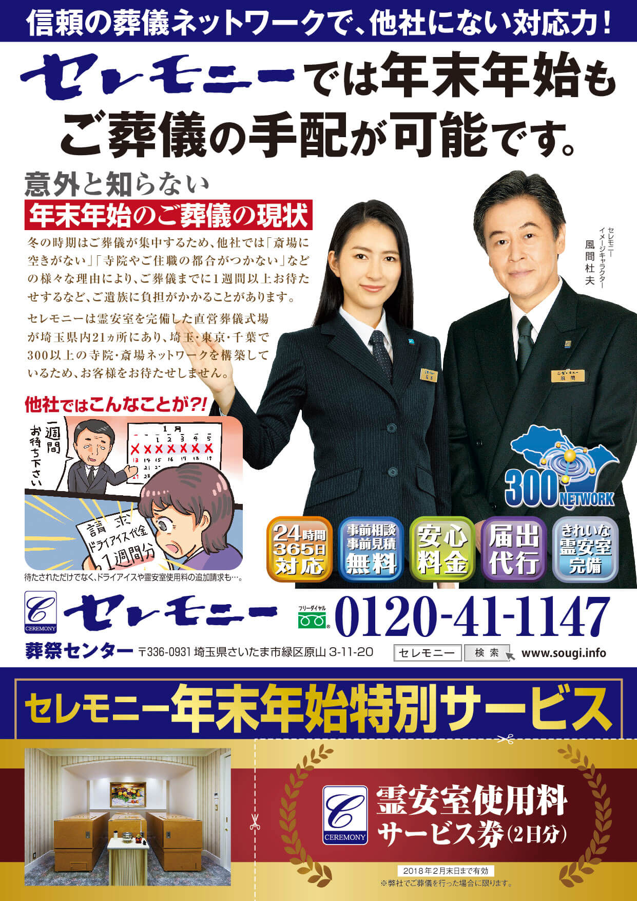 セレモニー越谷ホールでは年末年始特別サービスと題し、霊安室使用2日分無料サービスクーポンを発行しております。