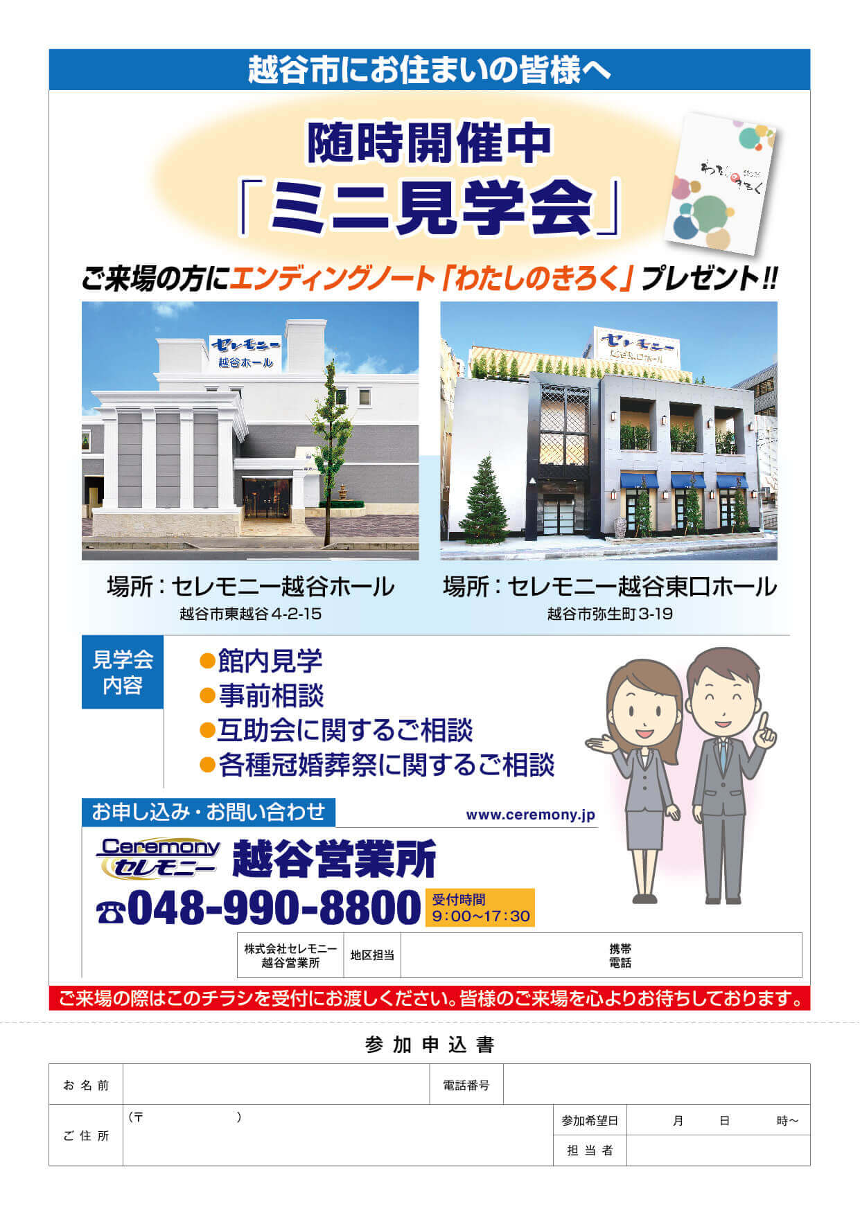 また、セレモニー越谷東口ホールでは当日も館内見学、無料の事前相談会を実施しておりますのでお気軽に御来館下さい。