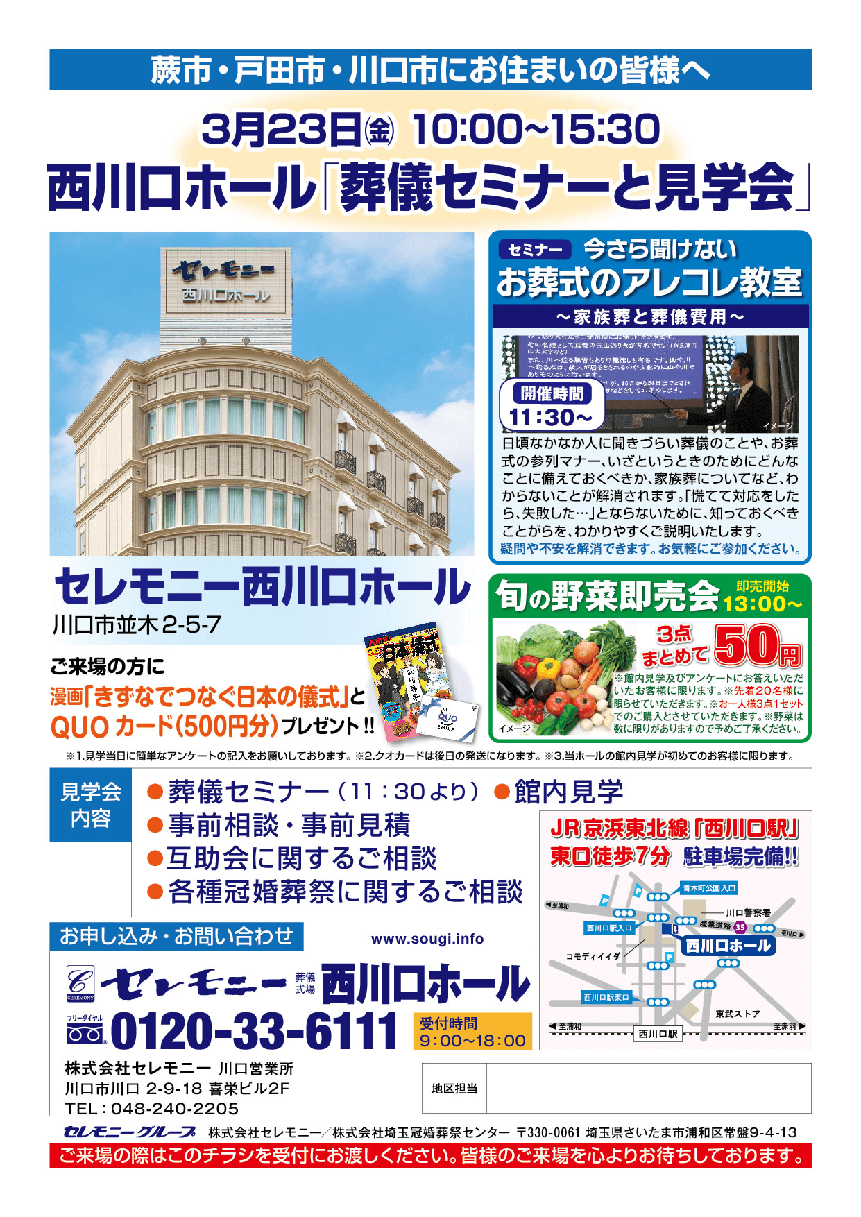 - 葬儀式場 セレモニー西川口では、多くのお客様にご来館いただき、もっとセレモニーの良さを知っていただきたい。そんな想いから、館内見学を行なったお客様に、QUOカード(500円分)をプレゼントしております。