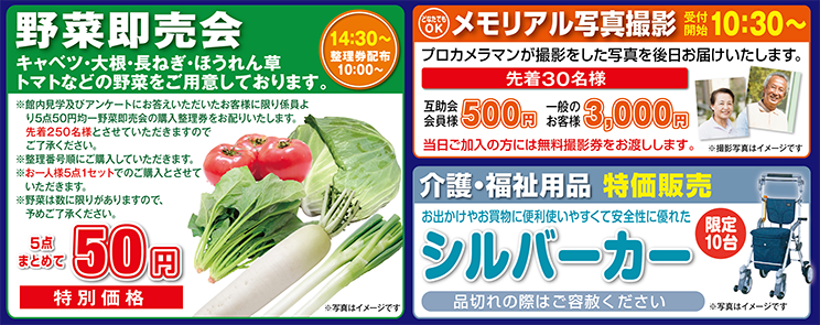 そのほか、各種祭壇・お料理・返礼品などの展示、 介護福祉用品特価販売