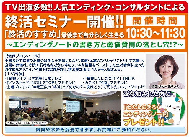 柳崎ホールでは4月12日(火)に講師に佐々木悦子さんをお招きして、終活セミナーを開催いたします。
