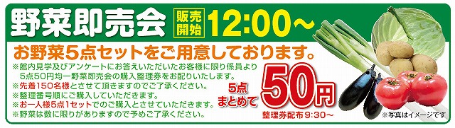 当日は野菜の5点セット50円の即売会や豪華景品が当たるガラポン抽選会も催します。