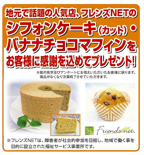 また、日頃の感謝を込め、地元で人気店のフレンズNETのバナナチョコマフィンとシフォンケーキをご来場者様にプレゼント。