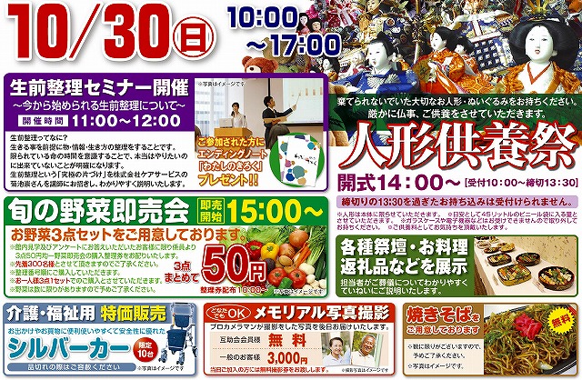といった催しを、10月30日(日)にはセレモニーフェアでも人気イベントの一つ、人形供養祭や野菜の即売会、
