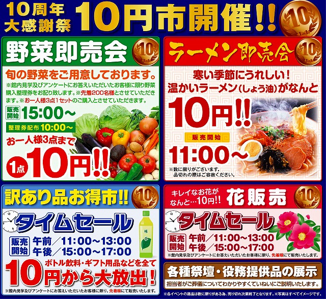 そこで、日頃の感謝を込めて、10円市を開催いたします。当日はラーメンや野菜、お花、訳あり商品を全て10円で販売します。