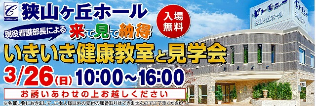 3月26日(日) 所沢市にある葬祭式場、セレモニー狭山ヶ丘ホールにて、いきき健康教室と見学会を開催いたします。