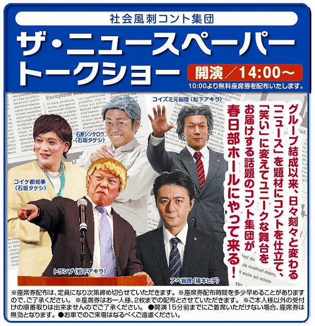 社会風刺コント集団として人気がある「ザ・ニュースペーパー」が春日部ホールにやって来ます。