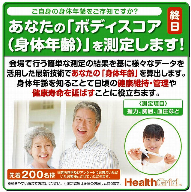 ご自身の身体年齢を知りたくないですか?会場で行なう簡単な測定の結果を基に様々なデータを活用した最新技術であなたの「身体年齢」を算出します。