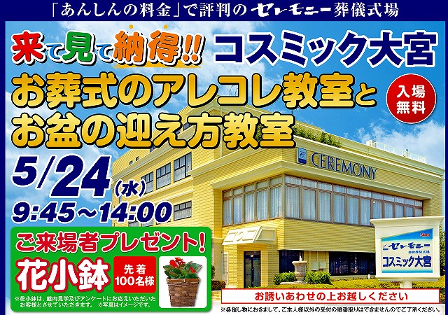 葬儀式場コスミック大宮で5月24日(水)「お葬式のアレコレ教室とお盆の迎え方教室」を開催いたします。