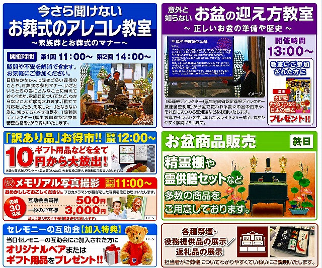 「お葬式のアレコレ教室」「お盆の迎え方教室」といった為にあるセミナーや訳あり品がお得な価格販売「訳あり品お得市」「メモリアル写真撮影」とイベント盛り沢山!!