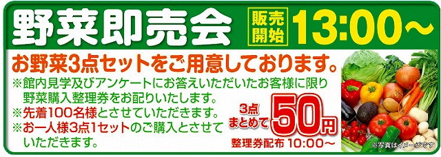 また、セレモニーフェアの定番、野菜を3点まとめて50円で販売。