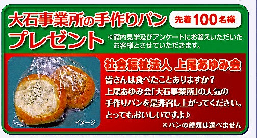 またご来場者には「社会福祉法人 上尾あゆみ会」の大石事業所の手作りぱんを100名様へ