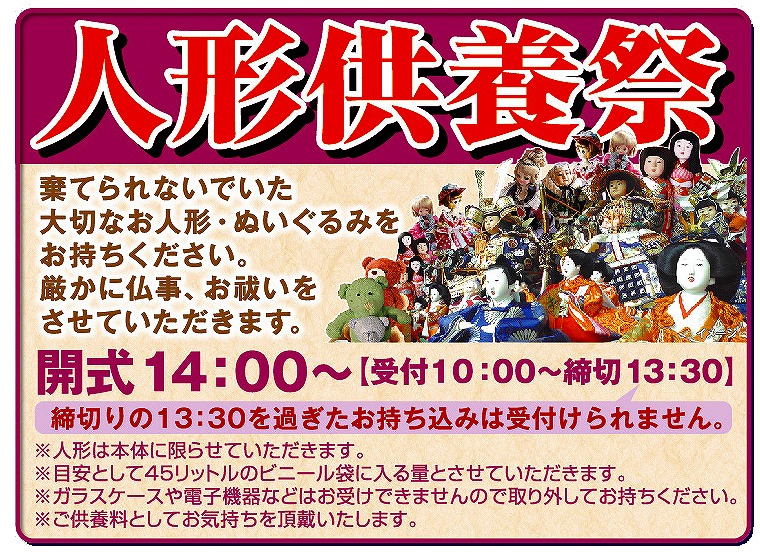 人形供養祭では大切にされていて、思いいれのある雛人形やぬいぐるみの供養を行ないます。