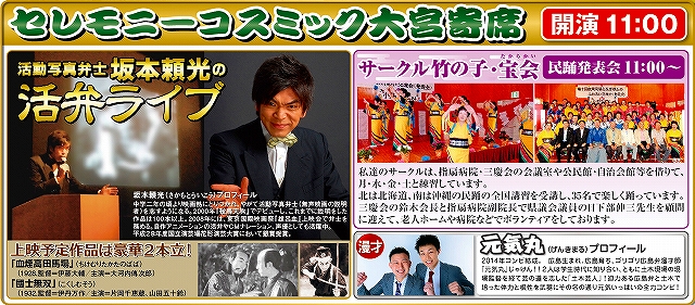 コスミック大宮寄席と題し、活動写真弁士の坂本頼光さんの「活弁ライブ」や漫才コンビの元気丸さん地元のサークル「竹の子・宝会」の皆様による民舞発表会を開催いたします。