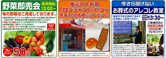 旬な野菜を3点50円で販売いたします。こちらも先着になりますので、品切れの際は