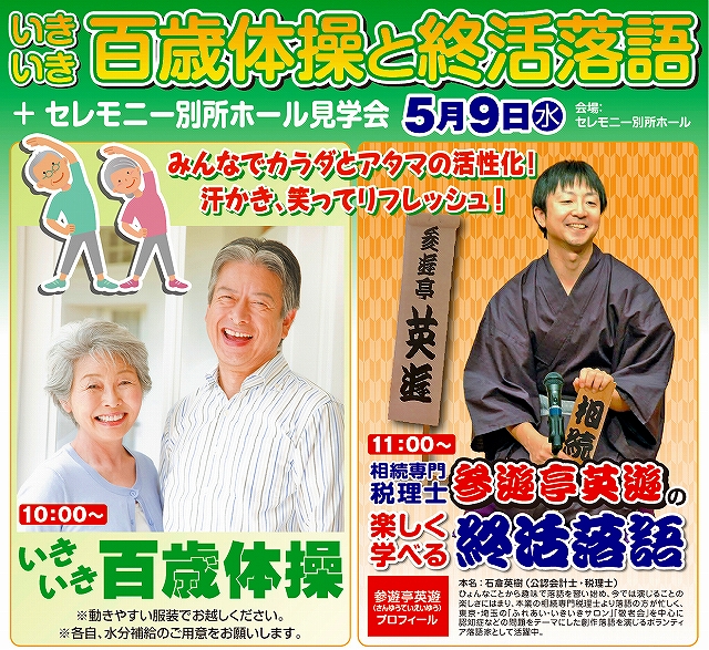 5月9日(水) セレモニー別所ホール いきいき百歳体操と終活落語を開催