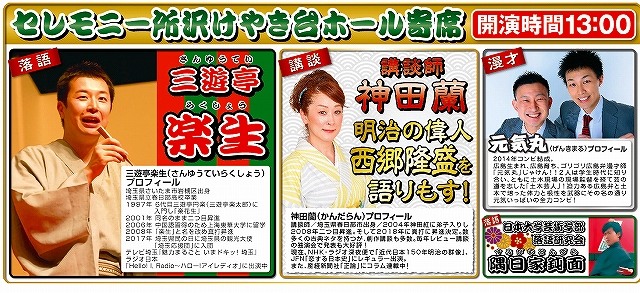 落語家の三遊亭楽生さん、講談師の神田蘭さん、漫才コンビの元気丸さん、日本大学芸術学部落語研究会の隅日家鈍面さんらが、