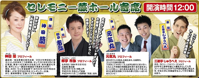 12時から開演のセレモニー蕨ホール寄席には、講談師の神田蘭さん、落語家の柳亭市弥さん、漫才コンビの元気丸さん、落語家の三遊亭じゅうべえさんが出演いたします。