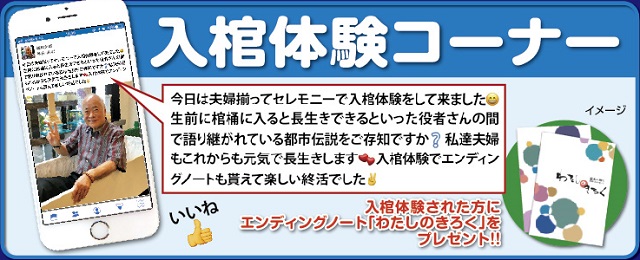 先着100名様に老舗和菓子屋「船橋屋」の和菓子をプレゼントや、入棺体験コーナーなどご案内しております。