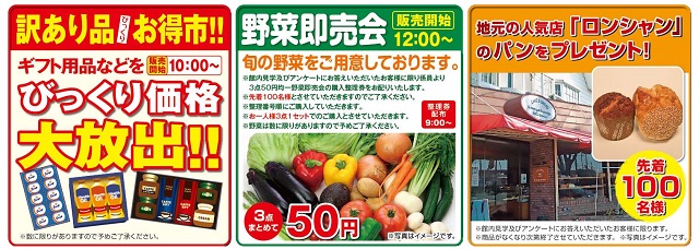 旬な野菜を3点50円で販売いたします。こちらも先着になりますので、品切れの際はご容赦ください。