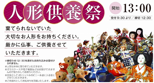 人形供養祭はそんな大切な人形をお預かりし、供養いたします。この時期になると、お客様からは「今年はやらないの?」「今度はいつ?」などお問合せが多い人気企画でもあります。是非、ご参加ください。