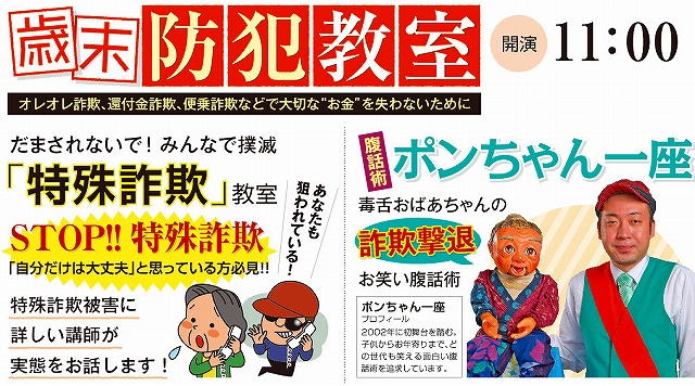 歳末防犯教室では、これだけ有名になってもまだ毎年被害者が後を絶たない、オレオレ詐欺を代表とした詐欺の手口を、わかりやすく講師が説明します。また、芸人さんのポンちゃん一座さんによる、手口を面白くわかりやすく紹介するコーナーも企画しました。