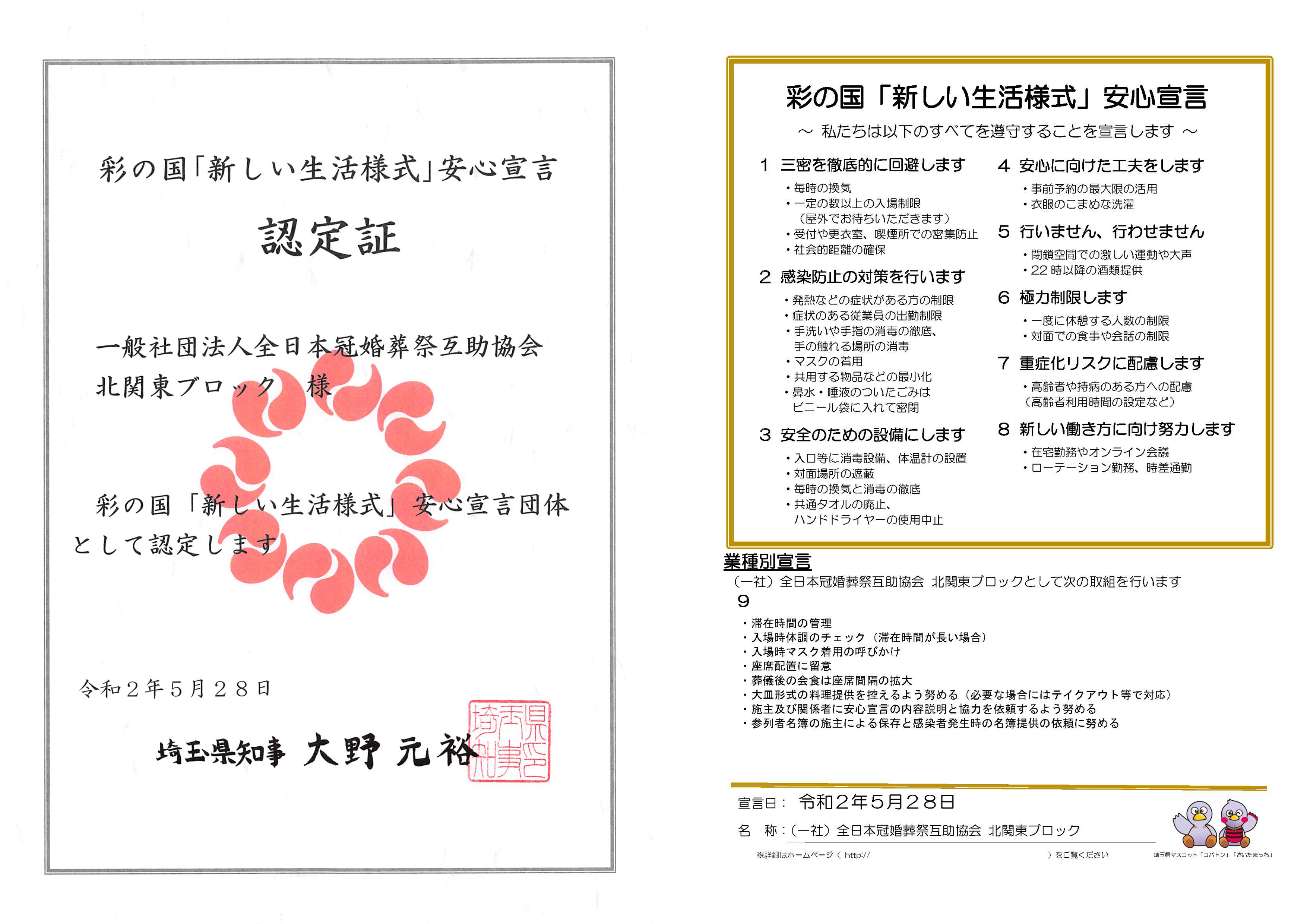 埼玉県が推進する『彩の国「新しい生活様式」安心宣言』を取り組む団体として認定されました。