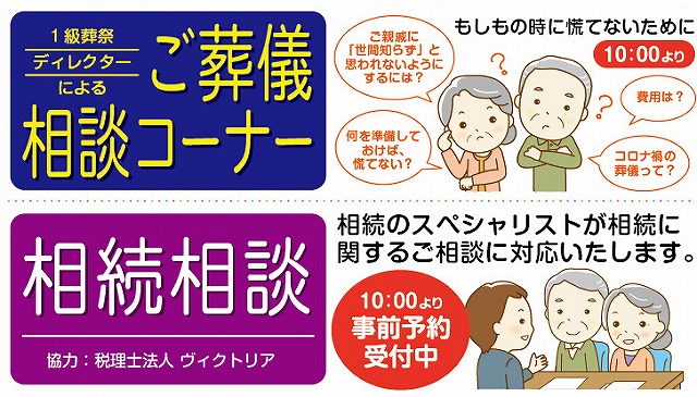 また、葬儀に関する疑問を一級葬祭ディレクターがお応えする「ご葬儀相談」や相続のプロの相談コーナー、
