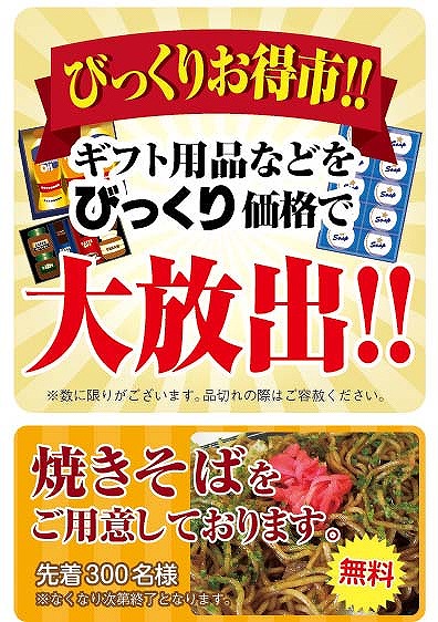 「びっくりお得市」や旬な野菜が3点で50円「野菜即売会」。そしてガラポン抽選会等々を催し物が盛りだくさん!!