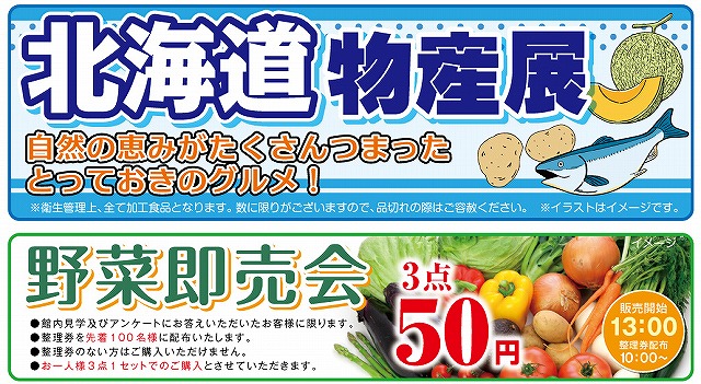 当日は、北海道の旬が楽しめる物産展、セレモニーの人気企画でお得な商品をお安く提供する