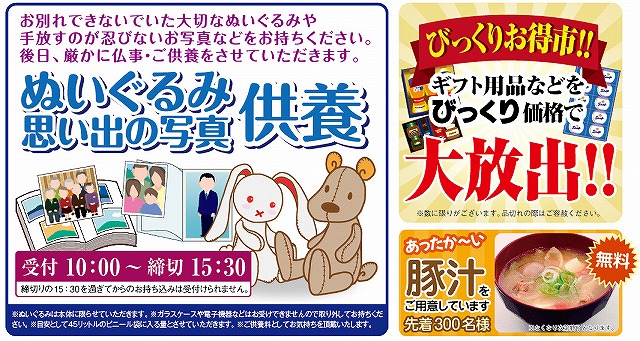 「びっくりお得市」や旬な野菜が3点で50円「野菜即売会」。そしてガラポン抽選会等々を催し物が盛りだくさん!!
