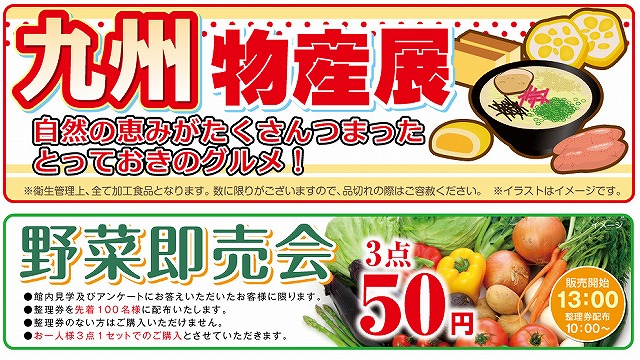 当日は、九州地方の旬が楽しめる物産展、セレモニーの人気企画でお得な商品をお安く提供する