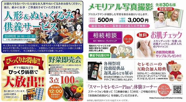 人気の3点100円野菜即売会、人形供養サービス、びっくりお得市、メモリアル写真撮影の他