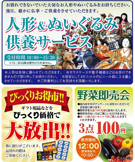 人気の北陸物産展や3点100円野菜即売会、人形供養サービス、びっくりお得市、メモリアル写真撮影の他