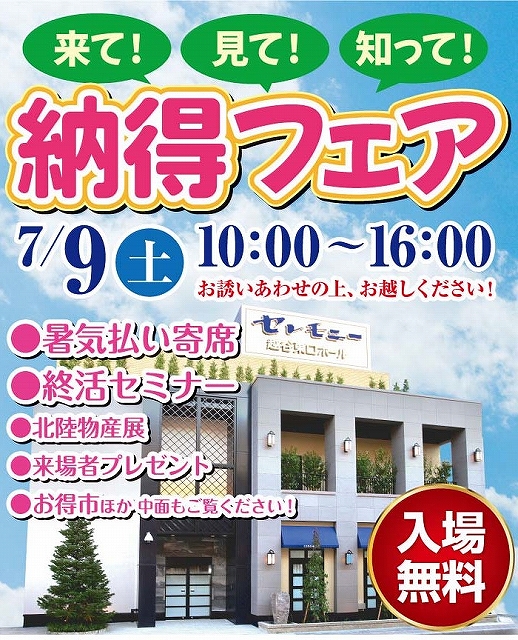 2022年7月9日(土)葬儀式場セレモニー越谷東口ホールにて納得フェアを開催いたします。