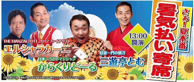 13:00からは「さぁ!夏本番暑気払い寄席」を開催!THEMANZAI2011、2012ファイナリストのエルシャラカーニ、日本一うざいマジシャンからくりどーる、