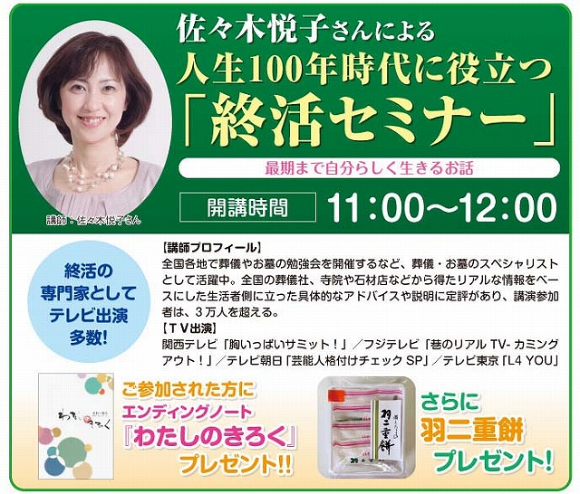 11:00からは終活の専門家としてテレビ出演もされる佐々木悦子先生による「終活セミナー」を開催。