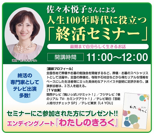 11:00からは社団法人日本エンディングサポート協会 佐々木悦子先生による「終活セミナー」を開催。