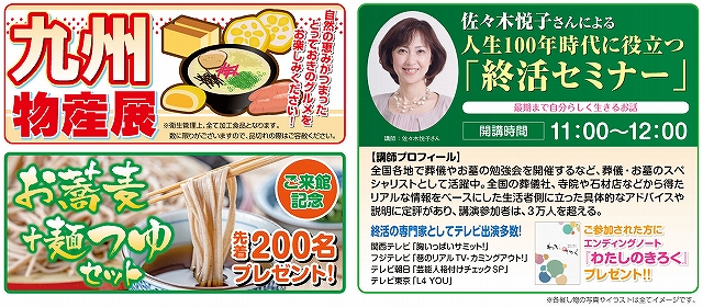 11:00からは社団法人日本エンディングサポート協会 終活の専門家、佐々木悦子先生による、人生100年時代に役立つ「終活セミナー」を開催。全国でセミナーを開催する貴重なお話を聞けるチャンスです!