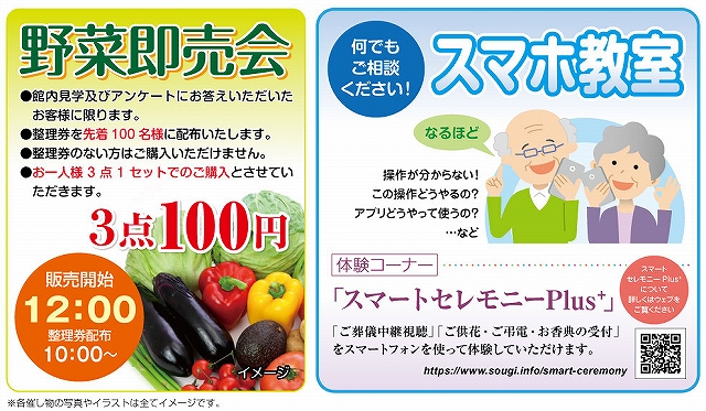 その他、旬のお野菜を3点100円で販売する「野菜即売会」やスマホ教室開催してます!メモリアル写真撮影、