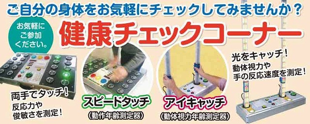 動作年齢測定器や動体視力年齢測定器を使ってお気軽に健康チェックができるコーナーや、