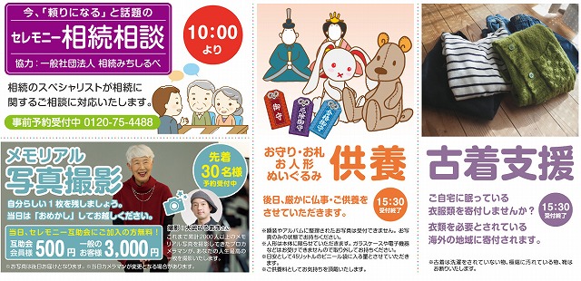 地域に寄付する「古着支援」やぬいぐるみや、お守り・お札をお預かりし後日ご供養する受付コーナーをご用意。また、12:00からはセレモニー互助会もっと活用塾を開催。
