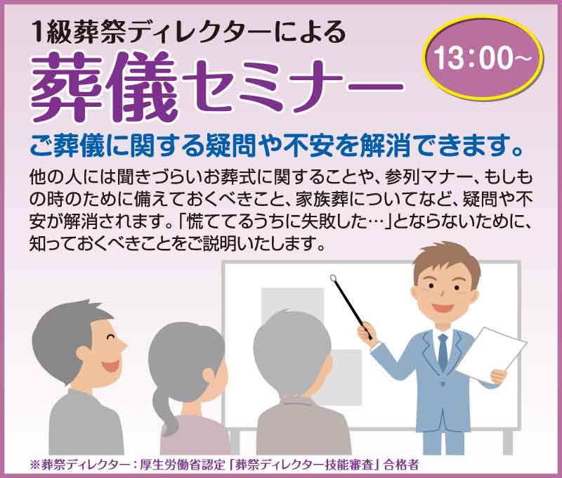 13:00からは葬儀セミナーを開催。1級葬祭ディレクターがご葬儀に関する疑問や不安を解消します!