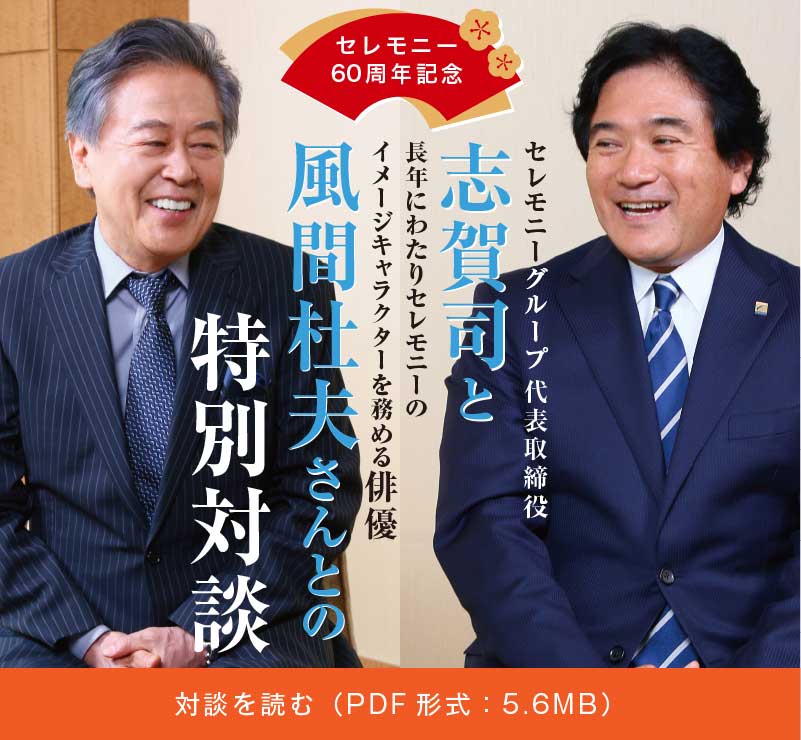 セレモニーグループのイメージキャラクターを長きにわたり務める風間杜夫さんとセレモニーグループ代表取締役 志賀司の特別対談の掲載やプレゼントキャンペーンもご案内した大変に見応えのあるチラシの内容となります。是非、ご覧ください。