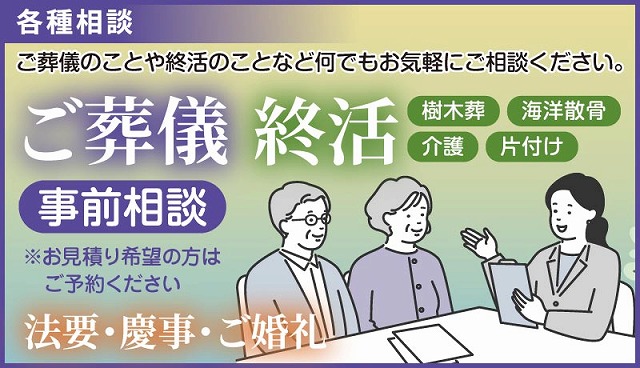 相談会ではご葬儀のことや、終活、法要、慶事、ご婚礼など不安や疑問などなんでもお気軽にご相談ください。