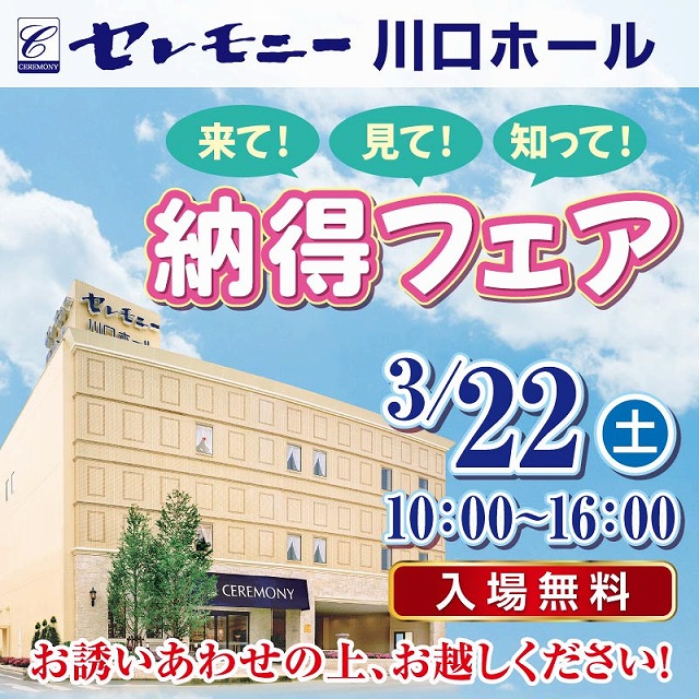 セレモニー川口ホールでは3月22日に「来て!見て!知って!納得フェア」を開催いたします。