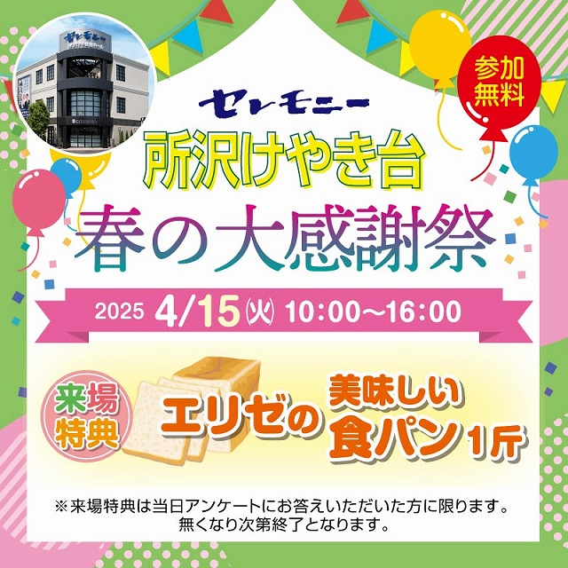 4月15日(火)に所沢けやき台ホールにて、日頃の感謝の気持ちを込めて「春の大感謝祭」を開催いたします!