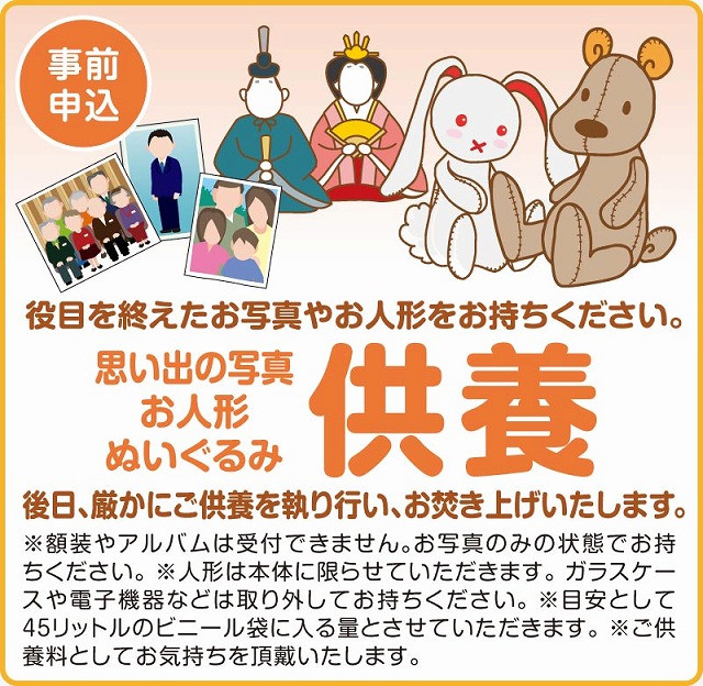 人形供養・古着支援をご希望の方は事前にお連絡をお願いいたします。