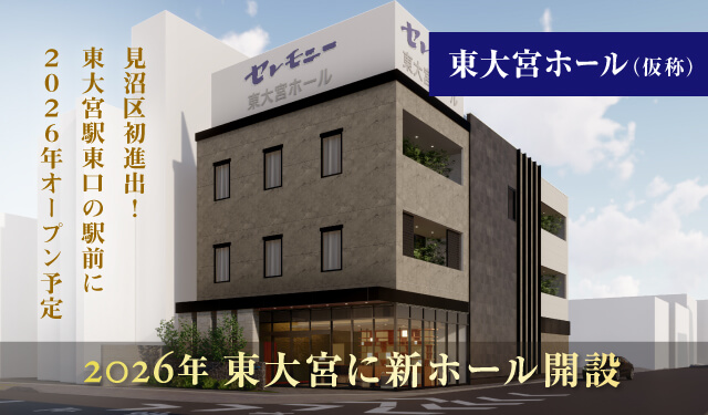さいたま市見沼区に新たな直営葬儀式場「セレモニー東大宮ホール(仮称)」を2026年にオープン(予定)する運びとなりましたので、ご案内申し上げます。