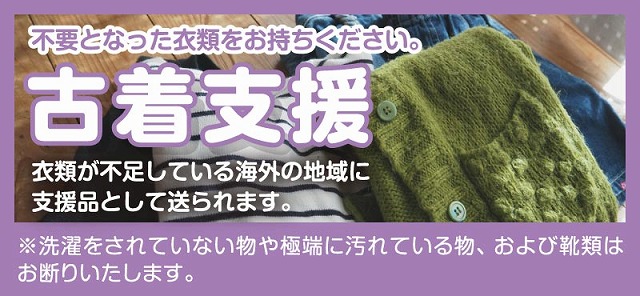 古着支援: 衣類が不足している海外の地域へ支援品として届けられます。